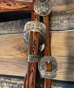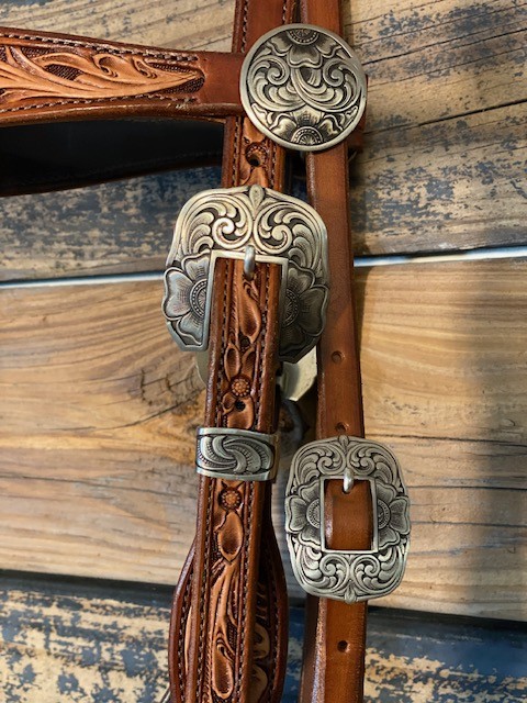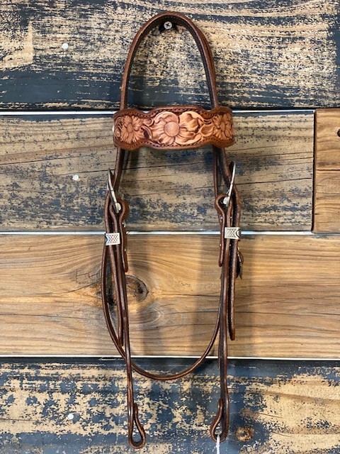 Two-toned floral tooled Browband Show Headstall. Made by Dylan Randall. Decatur, TX.