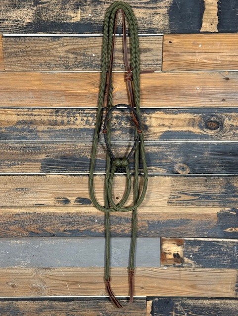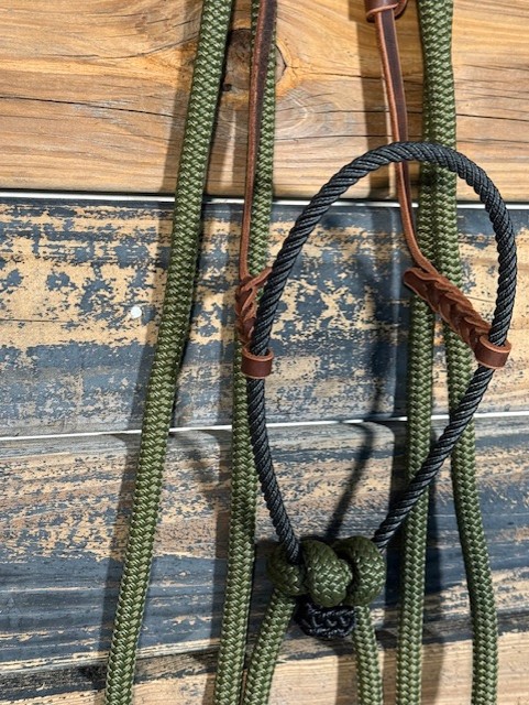 Loping Hackamore. Black Rope nose with leather hanger. Green split reins. Made in Texas.