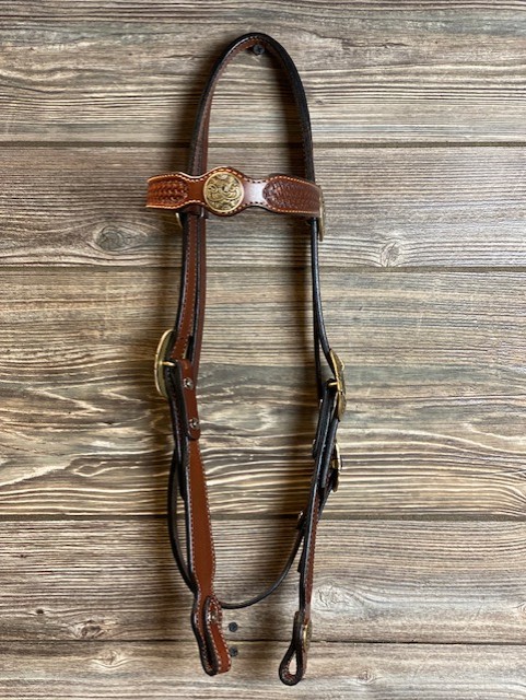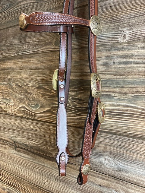 Heavy Oil Basketweave tooled browband headstall. Mincer Hardware. Made in NV, Horse Size.