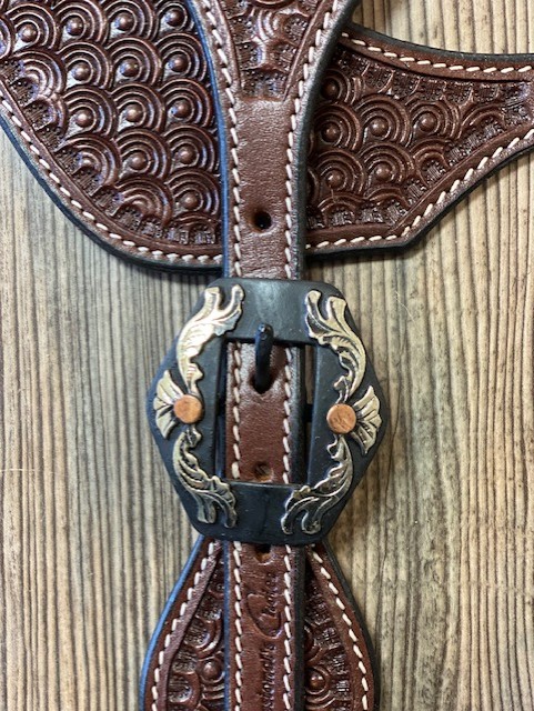 Rich dark chocolate leather that has been hand stamped with a shell-like pattern and top stitched. Features a hexagon shaped steel buckle with engraved silver and copper floral overlay.