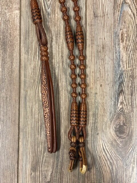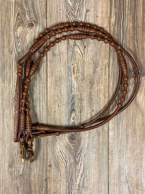 Rust rawhide with black accents. 30 Plait Romal Reins. 51 inch rein.