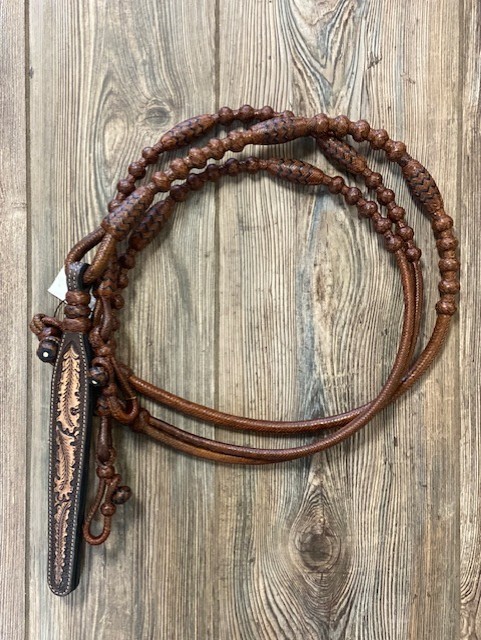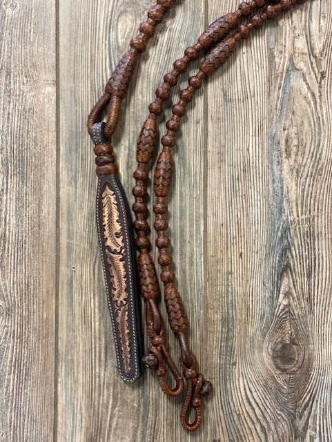 Rust rawhide with black accents. 30 Plait Romal Reins. 51 inch rein.