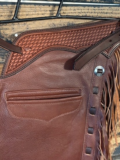 New Saddle House Shotgun Chaps. Size – Extra Small. Smooth Brandy. Pocket on the left.