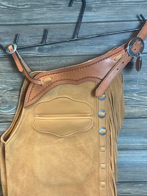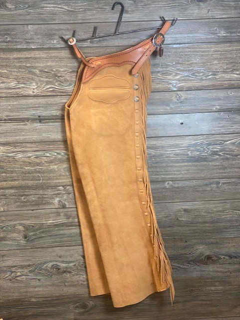 New Saddle House Shotgun Chaps. Size – Large. Honey Roughout. Pocket on Left.