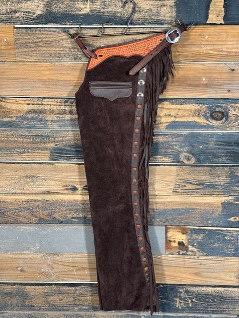 New Saddle House Shotgun Chaps. Size – Large. Cafe Roughout. Pocket on Left.