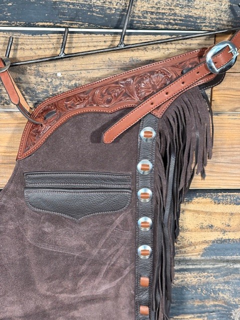 New Saddle House Shotgun Chaps. Size – Large. Cafe Roughout. Pocket on Left.
