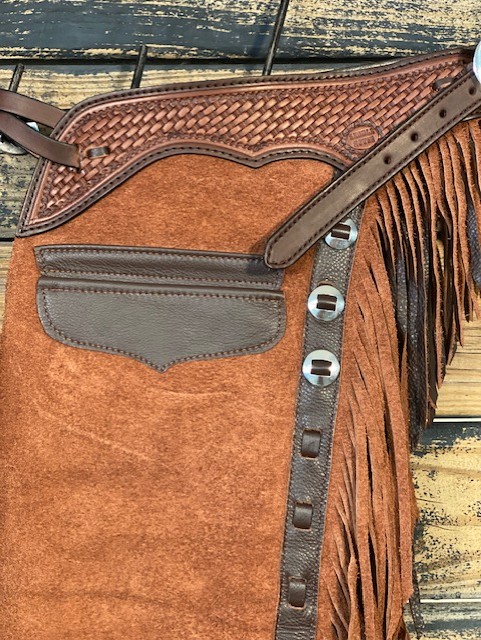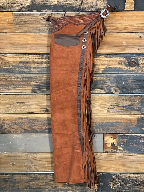 New Saddle House Shotgun Chaps. Size – Medium. Rust Roughout. Pocket on Left.