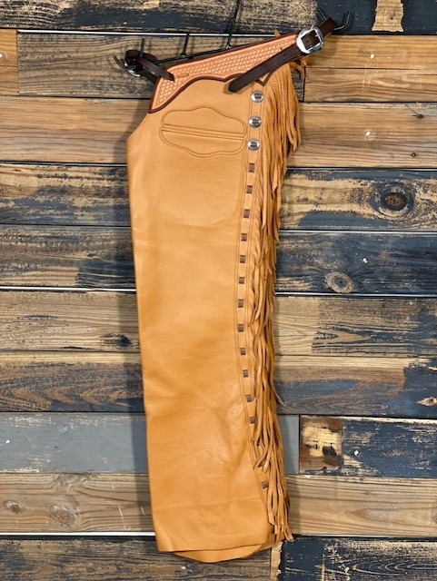 New Saddle House Shotgun Chaps. Size – Medium. Smooth Buckskin. Pocket on left.