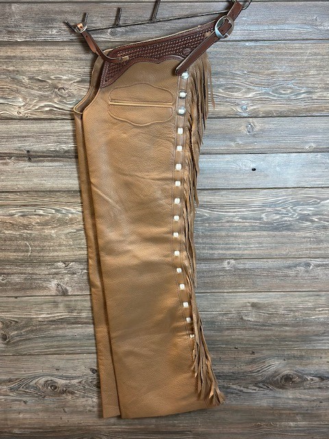 New Saddle House Shotgun Chaps. Size – Medium. Smooth Saddle. Pocket on left.