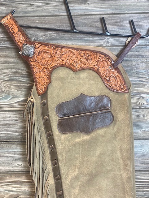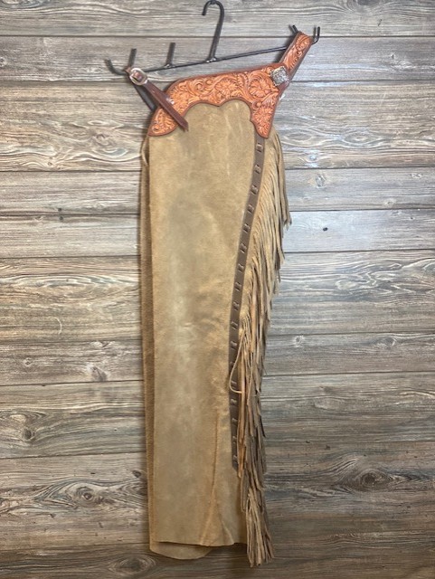 New Saddle House Shotgun Chaps by Bar Lyn Custom Leather. Size – Medium. Light Brown Roughout with Double Fringe. Pocket on right.
