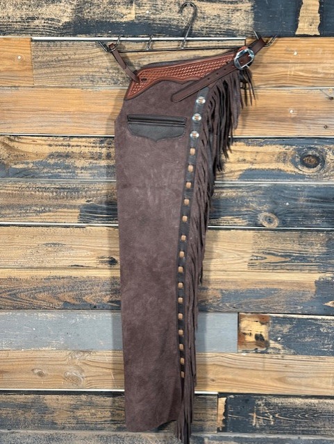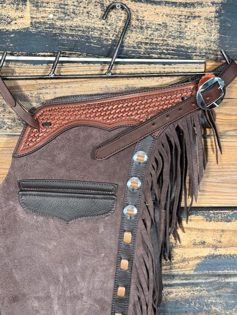 New Saddle House Shotgun Chaps. Size – Medium. Cafe Roughout. Pocket on Left.