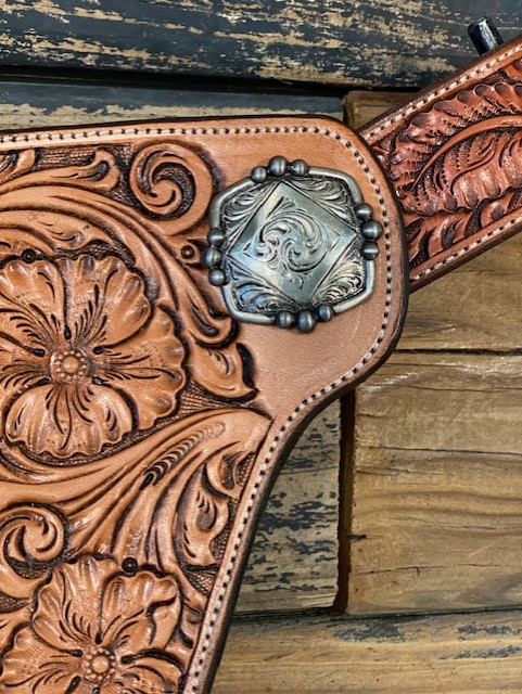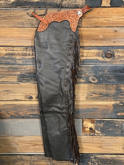 New Saddle House Shotgun Chaps by Bar Lyn Custom Leather. Size – Medium. Smooth Chocolate. Pocket on right.