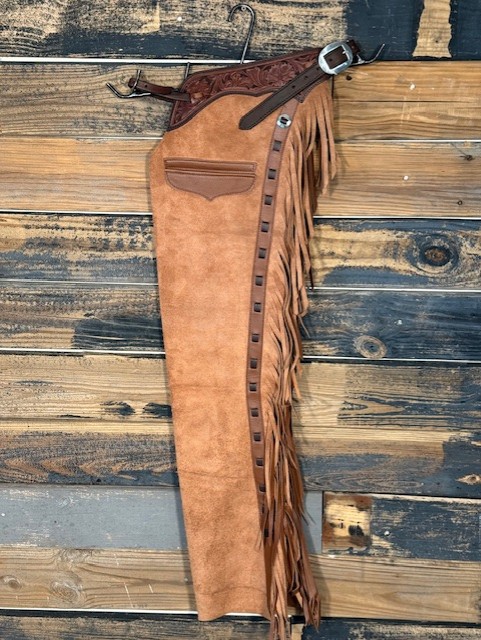 New Saddle House Shotgun Chaps. Size – Small. Whiskey Roughout. Pocket on Left.