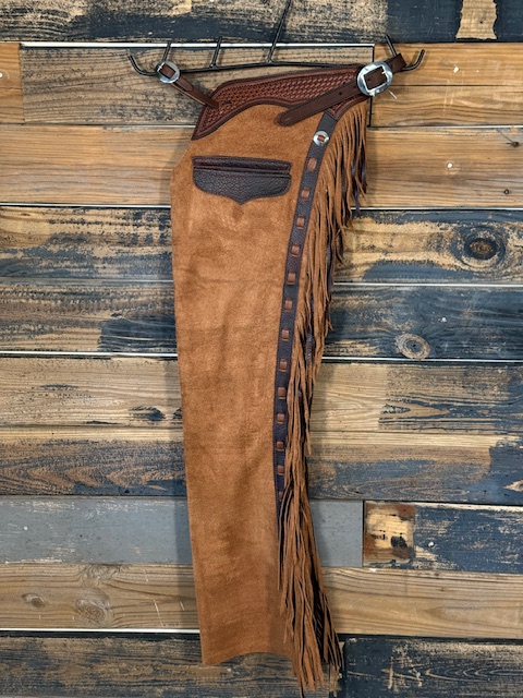 New Saddle House Shotgun Chaps. Size – Small. Blackberry Roughout. Pocket on Left.
