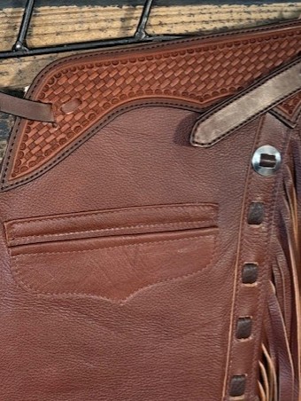 New Saddle House Shotgun Chaps. Size – Small. Smooth Brandy. Pocket on Left.