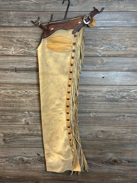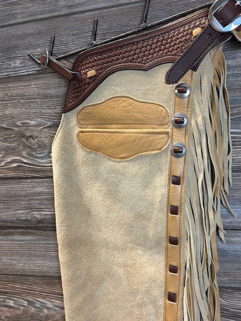 New Saddle House Shotgun Chaps. Size – Small. Wheat Roughout. Pocket on Left.