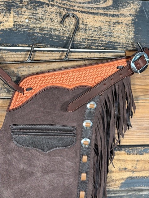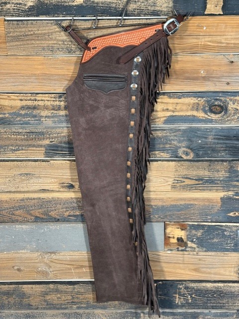 New Saddle House Shotgun Chaps. Size – Small. Cafe Roughout. Pocket on Left.