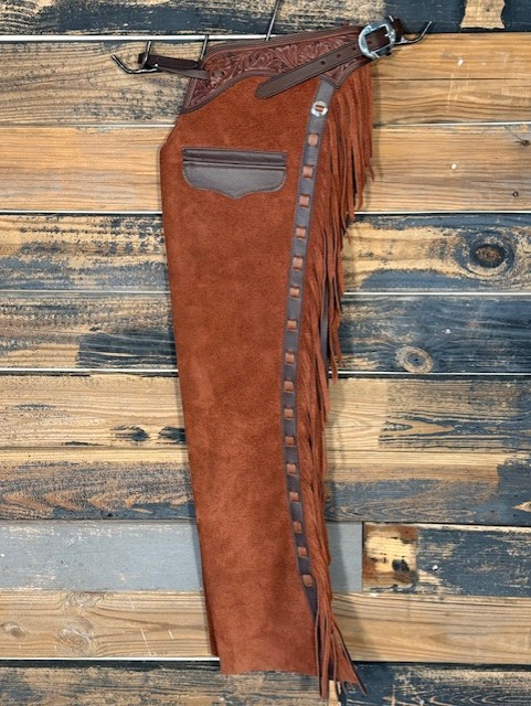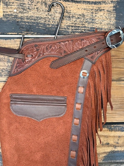 New Saddle House Shotgun Chaps. Size – Small. Rust Roughout. Pocket on Left.