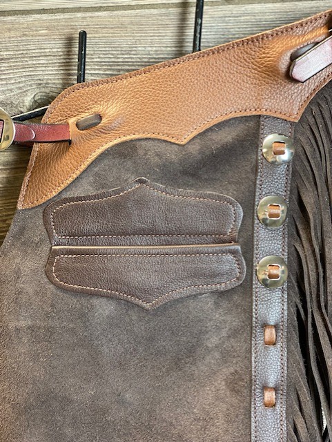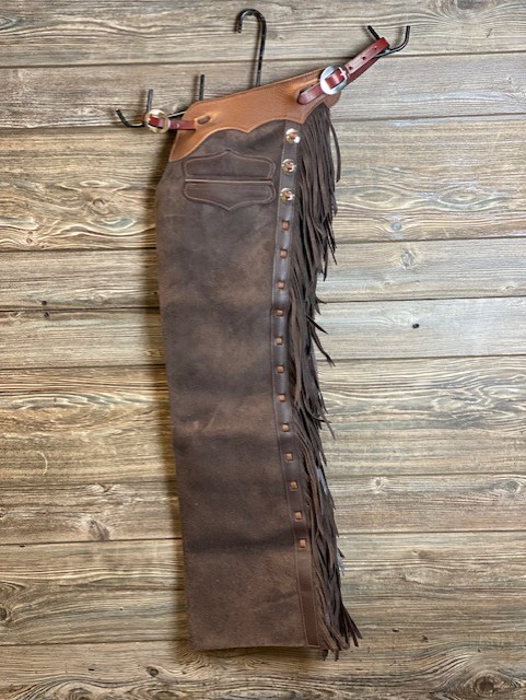 New Saddle House Shotgun Chaps. Size – Youth Large. Cafe Roughout. Pocket on Left.