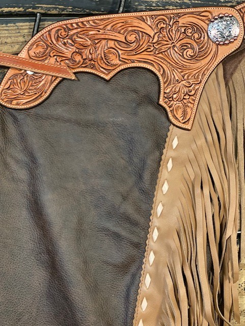 Saddle House Show Chaps by Bar Lyn Custom Leather. Size – Small. Smooth Distressed Brown. Pocket on Right.