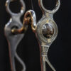 “The Santa Barbara style bit shank has been around for many years and is a style that is fun to make.  The canvas it presents to decorate is endless with possibilities.  The reining cow horse discipline may be the fastest growing facet or the horse industry currently.  I wanted to create a bit that fit horse and rider in that arena.  The bit has sterling silver inlays and 24k gold flower centers.”